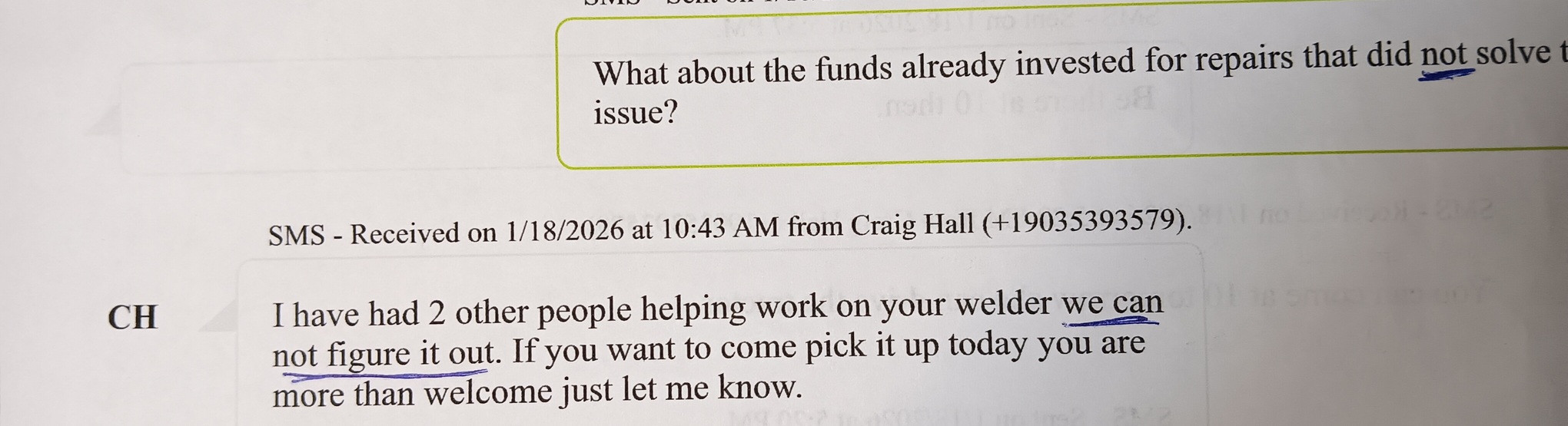 Summary of Transaction Venue's ActionsSince I had previously paid, I inquired about a refund for services not rendered. Mr. Hall refused. Conclusion - I'm out $258.11 and still have the same problem with my generator. The warranty was not honored nor was funds returned for the services NOT rendered. In simple terms, I was robbed.