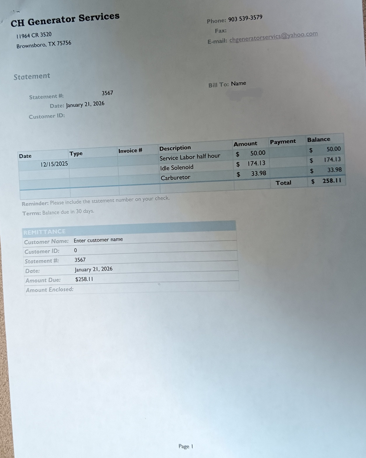 After initial contact with CH Generator Service and discussing the problem with my generator I delivered it to Mr. Craig Albert Hall, owner. Repairs were allegedly complete and I offered to pay my bill of $258.11 with a credit card to allow myself an avenue of recourse if required Mr. Hall refused credit card payment, which is better now better understood. That should have been my first clue. I paid cash. Returned home only to discover generator still exhibited the exact same issue it did prior to repair. I again contacted Mr. Hall and explained the issue again. I inquired if he would warrant his work. He verbally said and via email stated that he did. I was instructed to return the generator which I did. Mr. Hall later contacted me and informed me he was to, figure it out, which made me begin to question the qualifications of this business. The warranty was not honored nor funds returned fo the services not rendered.
